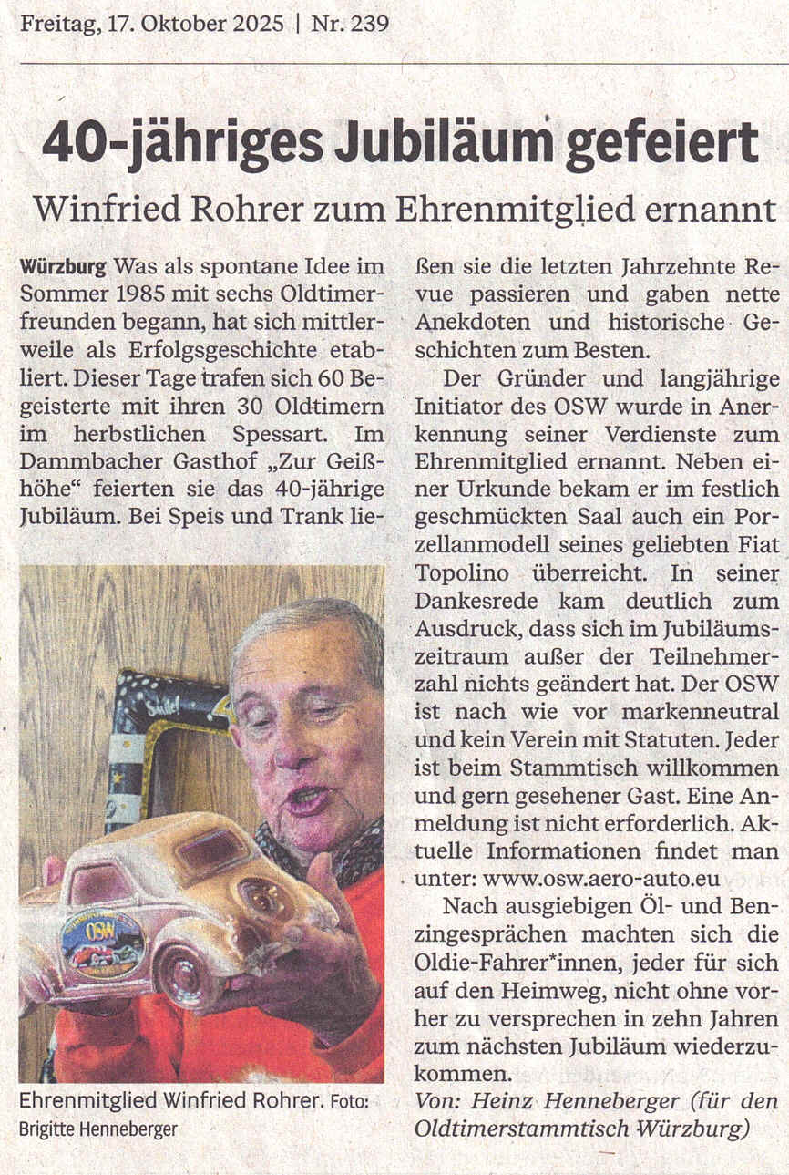 2025: 40 Jahre Oldtimer Stammtisch Würzburg 2015: 30 Jahre Oldtimer Stammtisch Würzburg 2010: 25 Jahre Oldtimer Stammtisch Würzburg Unsere verstorbenen OSW-Freunde Mitteilungen und Infos zur